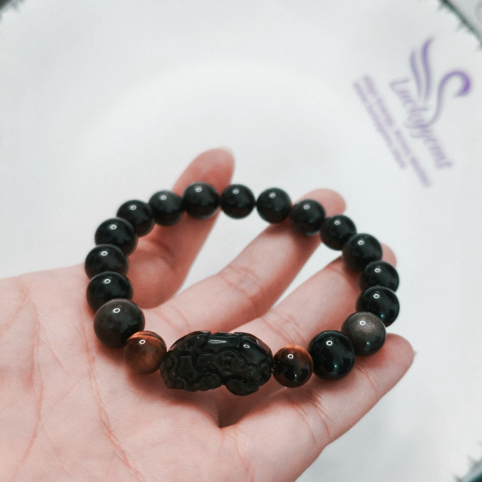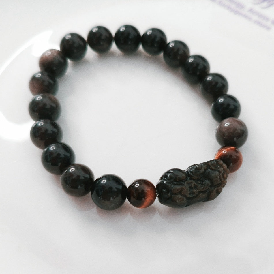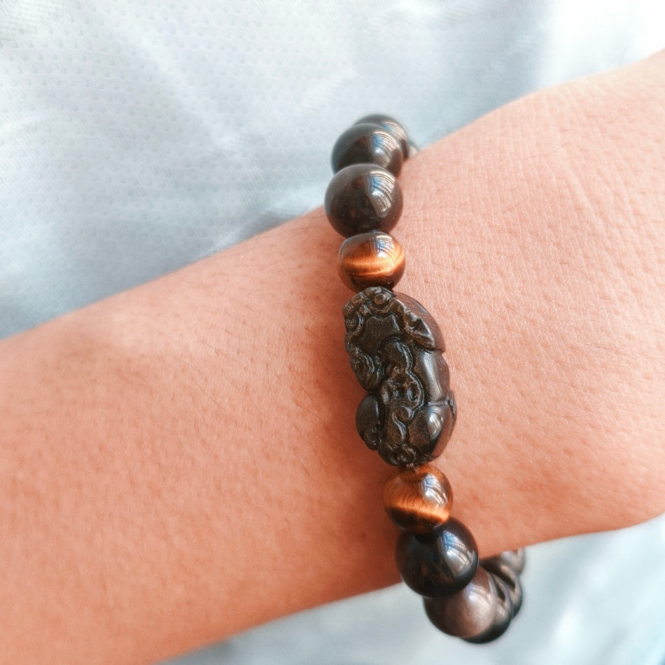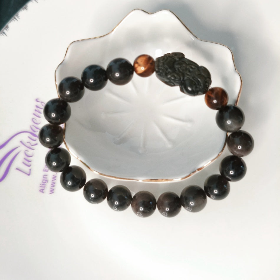 Wealth*Protection*Courage 10mm Silver Sheen Obsidian & Gold Sheen Obsidian Pixiu Bracelet with 8.4mm Tiger's Eye Beads
