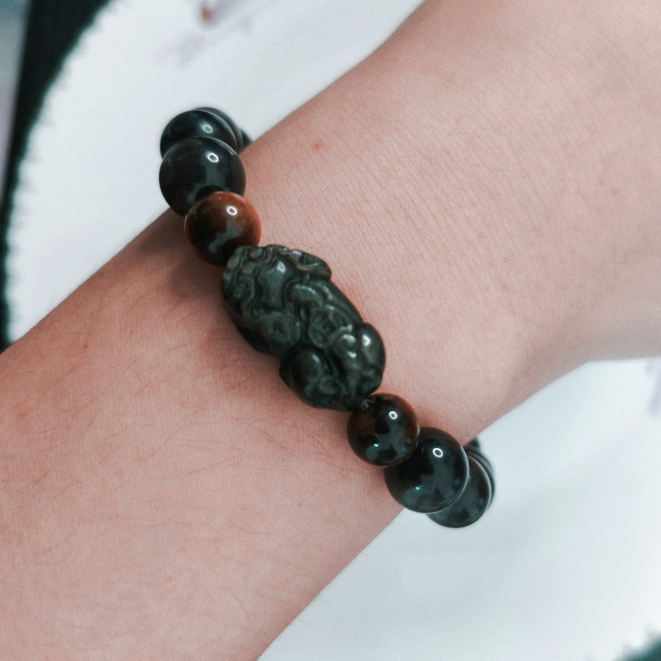 This unique bracelet is a perfect blend of beauty and symbolism. Crafted with 10mm silver sheen obsidian and gold sheen obsidian beads, it exudes an air of mystery and elegance. The centerpiece is a meticulously carved Pixiu charm, measuring 22*12mm. In traditional Chinese culture, Pixiu is a powerful mythical creature renowned for attracting wealth and warding off evil spirits.
